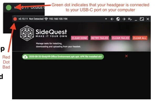 Plug the USB-C cable from the headset into the computer. Restart the headgear to get the Dot on SIDEQUEST (SQ) and the GREEN light on the side of the Gear to be GREEN as in the picture below