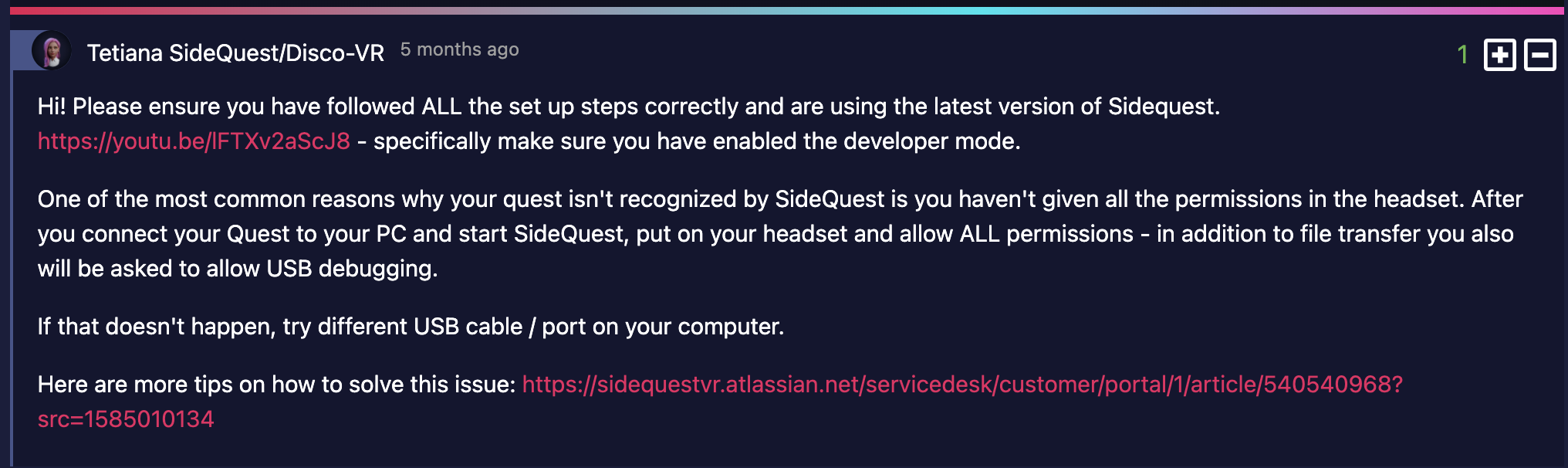 This is very important: For those of you sideloading onto Facebook’s Oculus, both your Oculus headset AND that device paired with your smartphone’s Oculus Mobile App, MUST BE IN DEVELOPER MODE. Here is a snapshot of a recent community post which indicates how frustrating this can be to users like you and me.
